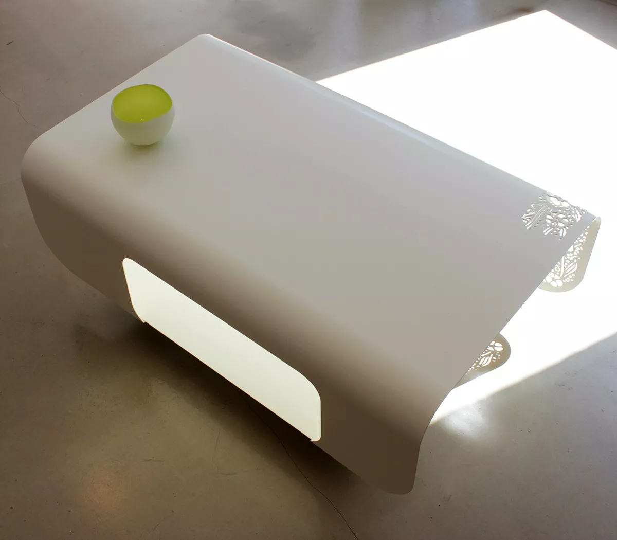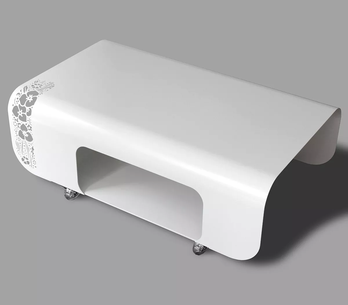 Couchtisch mit abgerundeten Linien, inspiriert von den Kotflügeln alter Autos.