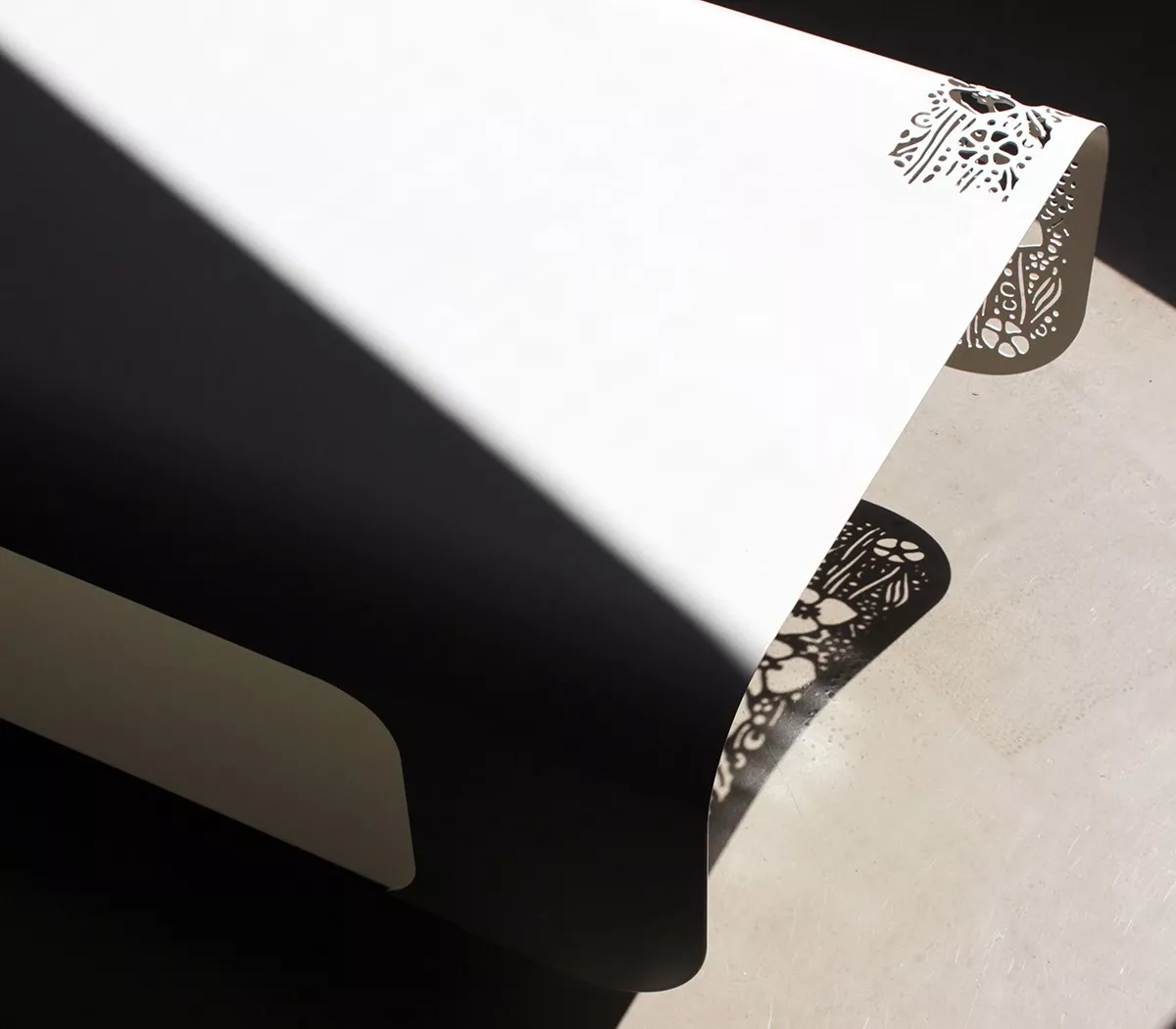 Auf dem weißen Modell auf dem Foto wurde ein Blumenmotiv hinzugefügt. Es wurde nur an einer Ecke ausgeschnitten, um einen Eindruck von Symmetrie und Monotonie zu vermeiden.